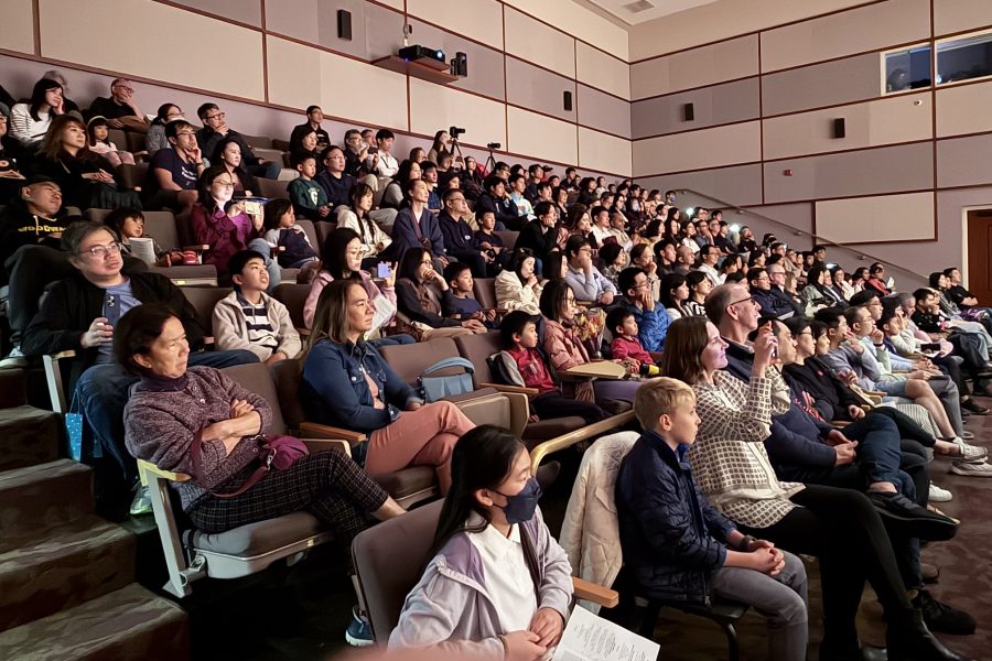 家長義工耿欣寧與小孩參加了當晚的音樂會。(薛明珠/大紀元)