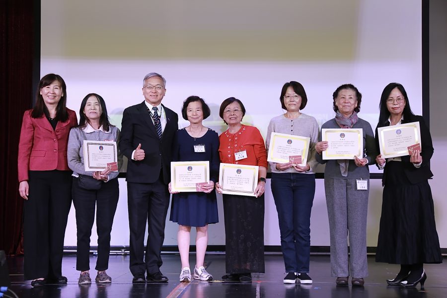 表彰志工團的團長、組長與媽媽志工代表。從左至右:莊雅淑主任、張嘉周副組長、張其南組長、朱永昌副處長、高玉麗團長、徐蓮組長、代表孫愛薇。(薛明珠/大紀元)
