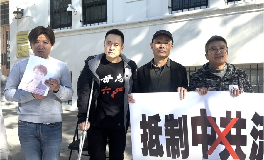 民運人士製作的宣傳牌 (林若水/大紀元 )
