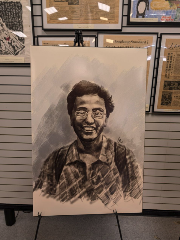 進入大廳看到的第一幅畫作是海外華人熟知的「編程隨想」阮曉寰的素描肖像:笑咪咪的眼神,展現出人物和藹可親的性格。他本是中國社會精英,利用電腦技術悄悄給民眾傳遞公民知識教育,最後被判入監七年。