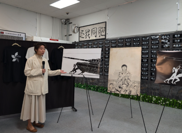 中國民主黨黨員劉芳觀展後感到,圖像比文字更加打動人心。她印象最深的是三個學生舉起坦克的畫作:「我很喜歡這種像版畫的風格,彷彿雕塑一樣刻入每個人的記憶。」