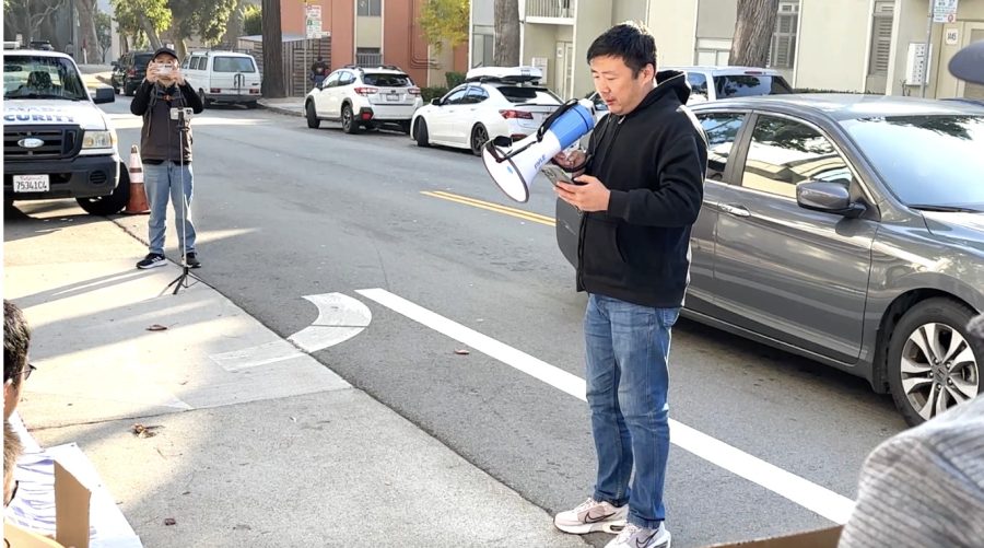他在現場帶領眾人呼喊口號:「停止迫害基督徒!停止迫害法輪功!停止迫害維吾爾與藏族人士!停止破壞香港自由!釋放所有良心犯!打倒共產黨!審判習近平!」