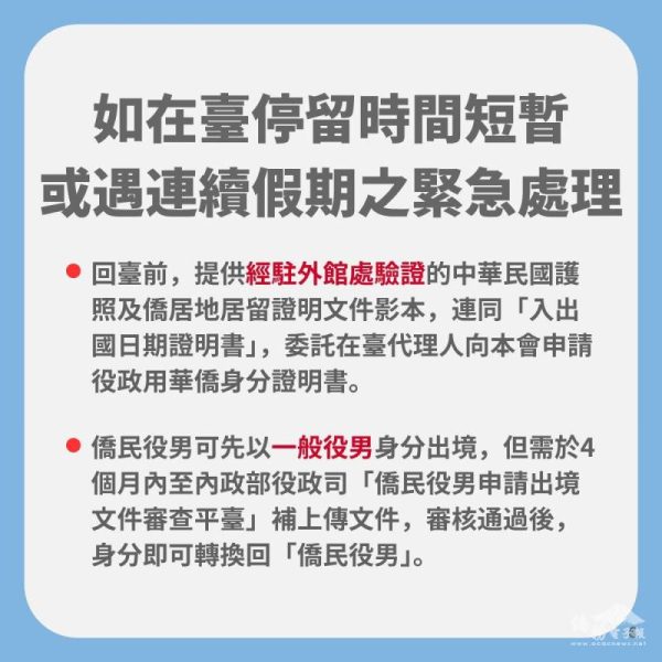三、如在臺停留時間短暫或遇連續假期之緊急處理