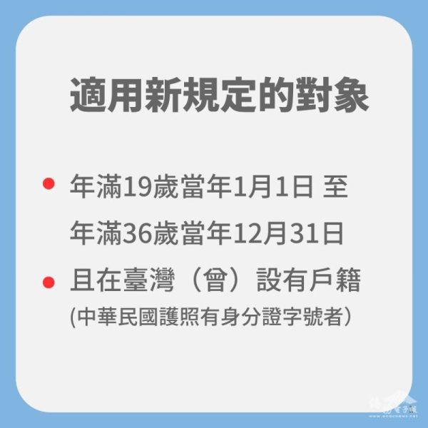 符合下列條件者,須依規定申請出境許可:年滿19歲當年1月1日,至年滿36歲當年12月31日,且在臺(曾)設有戶籍的男(中華民國護照上有身分證字號)。