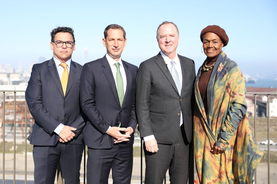 發佈會後,發言人合影留念。左起分別為:開發商「第五空間」(Fifth Space)管理合夥人恩里克·蘭達(Enrique Landa)、舊金山市長羅偉(Daniel Lurie)、謝安達、聯邦眾議員拉蒂法·西蒙(Lateefah Simon)。(路小玉 / 大紀元)