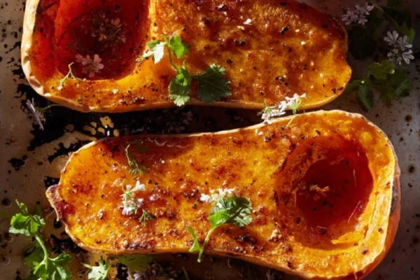 4. 烤制35至45分鐘,直至南瓜邊緣呈金黃色且南瓜變軟。取出南瓜稍作冷卻,約5分鐘。切成四塊,可搭配新鮮歐芹或香菜葉、青檸角裝飾後上桌。