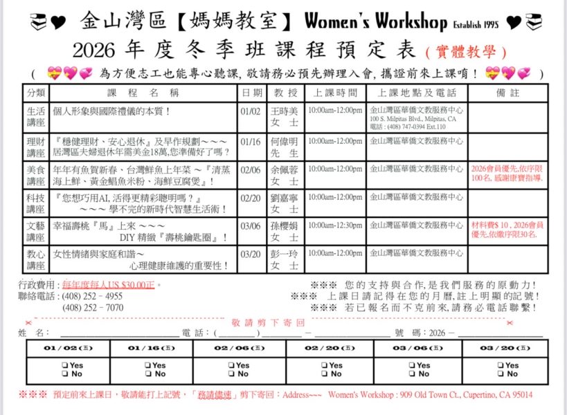 【金山灣區媽媽教室訊】金山灣區媽媽教室,公布2026年冬季班(1月至3月)課程表,內容涵蓋生活、理財、美食、科技、文藝及教心等主題,將邀請多位專業講師,帶來豐富實用的講座與手作體驗,課程地點均為金山灣區華僑文教服務中心(100 S. Milpitas Blvd., Milpitas, CA)。