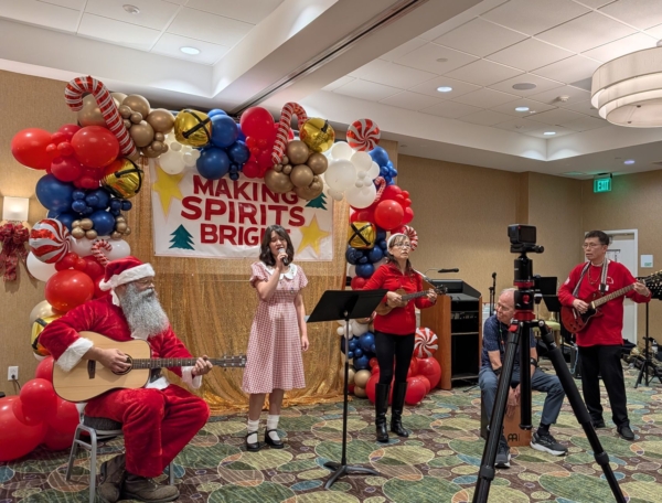 活動中,主辦方還安排了多輪歌曲、吉他和小提琴演奏助興,曲目包括聖誕頌歌《平安夜》和美國國歌等,鑽石吧市議員鄧嘉猷和幾位親友一起演奏吉他,讓眾人沉浸在輕鬆友愛的氛圍中。