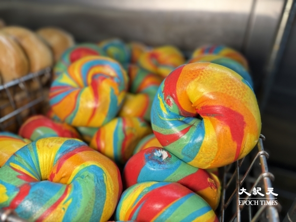 走進Liberty Bagels,最吸引人的就是繽紛色彩。彩虹貝果、紅白藍的節慶限定色、粉紅色的乳癌防治主題、甚至企業客製化的品牌顏色,每一顆都像是用心雕琢的小型藝術品。Victor形容這些貝果時語氣充滿了自豪:「說真的,沒有人能做得比我們更漂亮。客人常說捨不得吃,只想先拍照。」