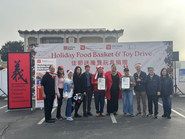 【2025年12月15日訊】(記者徐曼沅洛杉磯報導)華埠服務中心(CSC)與南加州華人律師協會(SCCLA)於13日(週六)上午,在洛杉磯華埠國泰銀行停車場,聯合舉辦「2025年第39屆華埠佳節送暖」社區公益活動,透過派發食品與玩具,向弱勢家庭送上節慶關懷,約三百個家庭受惠。