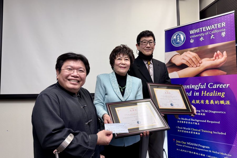 【大紀元記者薛明珠聖荷西報導】世界臺灣同鄉聯誼總會總會長吳睦野、北加州華僑會館館長吳毓苹伉儷,於 12 月 16 日(週二)捐贈一萬美元予非營利教育機構加州白水中醫藥大學(Whitewater University of California),支持該校長期推動的免費義診與公益醫療服務,嘉惠灣區弱勢族群與無保險民眾。