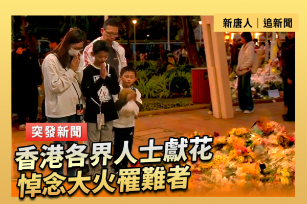美東時間11月29日,中國香港,香港各界人士獻花悼念大火罹難者。新唐人、大紀元進行網絡重播。
