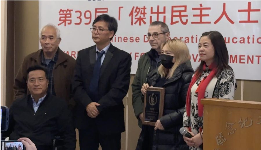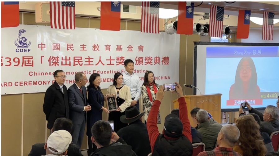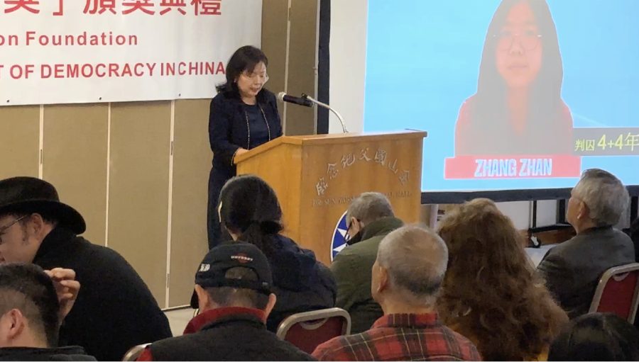 中國大陸公民記者張展獲頒傑出民主人士獎,由原深圳律師周君紅代為領獎。(林若水/大紀元)