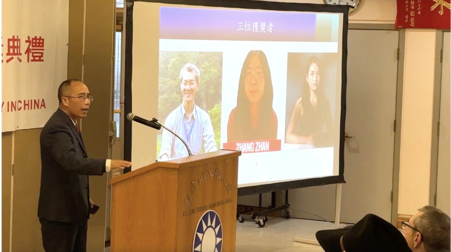 臺灣國立政治大學國家發展研究所李酉潭教授代明居正教授领奖。(林若水/大紀元)