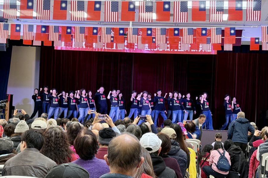 全場齊聲高唱《中華民國頌》與《梅花》,氣氛推向最高潮,與會者揮舞中華民國與美國國旗,場面熱烈感人。(薛明珠/大紀元)