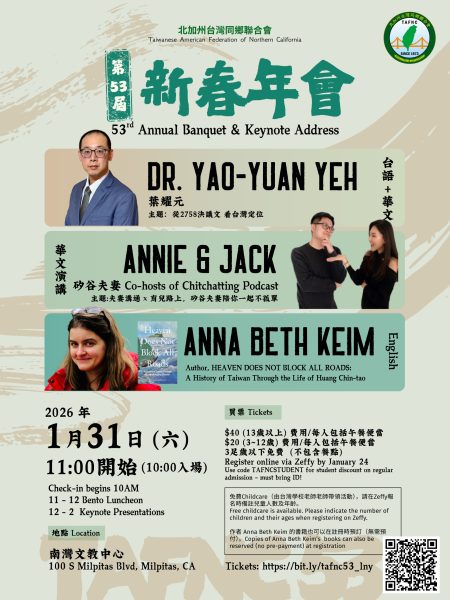 【聯合會訊】北加州臺灣同鄉聯合會(TAFNC)將於1月31日(週六),在南灣僑教中心舉辦第53屆新春年會,規劃橫跨臺語、華語與英語的主題演講,邀請僑界民眾共迎新春。