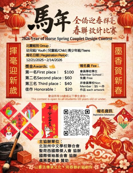 【大紀元記者薛明珠苗必達報導】為迎接丙午馬年到來,北加州中文學校聯合會特別舉辦「2026 馬年全僑迎春揮毫春聯設計比賽」,鼓勵北加州地區青少年透過書法與繪畫創作,認識黃曆新年的文化意涵,並以創意方式傳承中華傳統年俗。