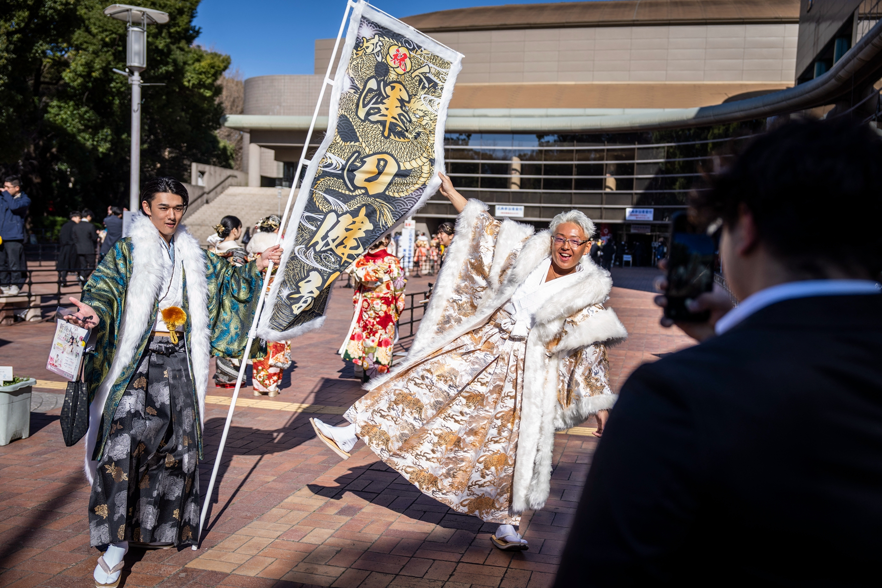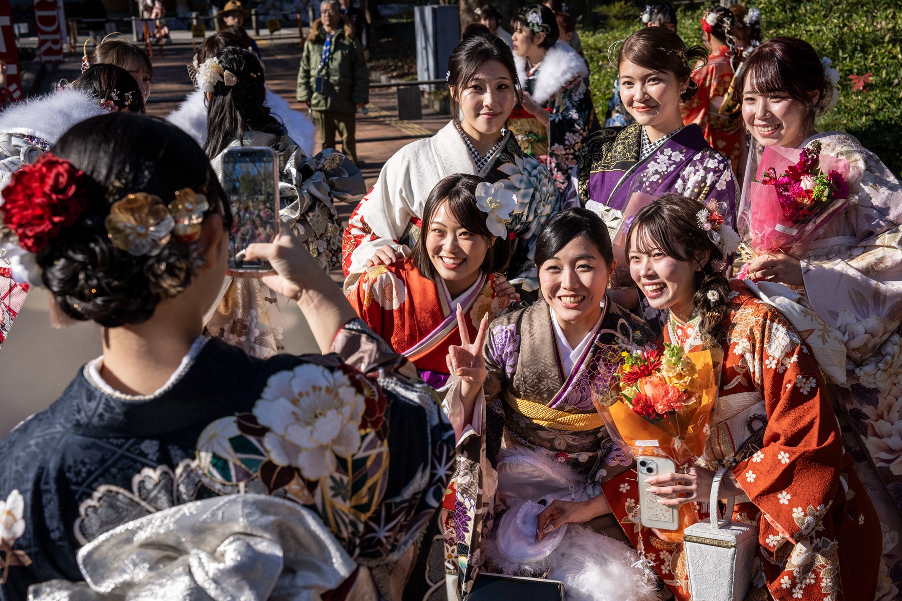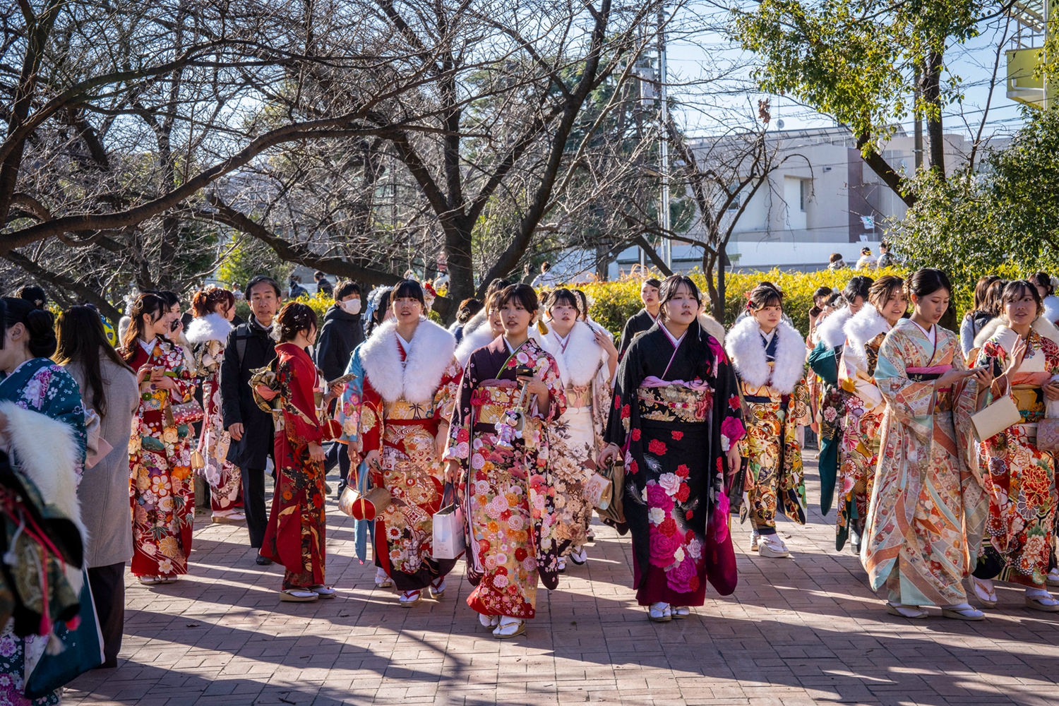 在成人節這天,這些身著豔麗和服的日本少女無論走到哪裡,都會成為眾人矚目的焦點,遊客們更是喜歡與她們合影留念。由於天氣寒冷,她們外出參加儀式時,會在和服外圍上白色的毛茸裝飾,三五成群地邁著和式小碎步走在大街上,每個人儼然成了一道亮麗的風景線。