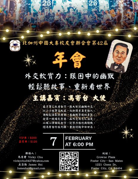 【大紀元記者薛明珠苗必達報導】北加州中國大專校友會聯合會,於1月15日(週四),在南灣僑教中心舉行記者會,宣布第42屆年會將於2月7日(週六)隆重舉行,並特別邀請資深外交官馮寄台大使擔任主講嘉賓。