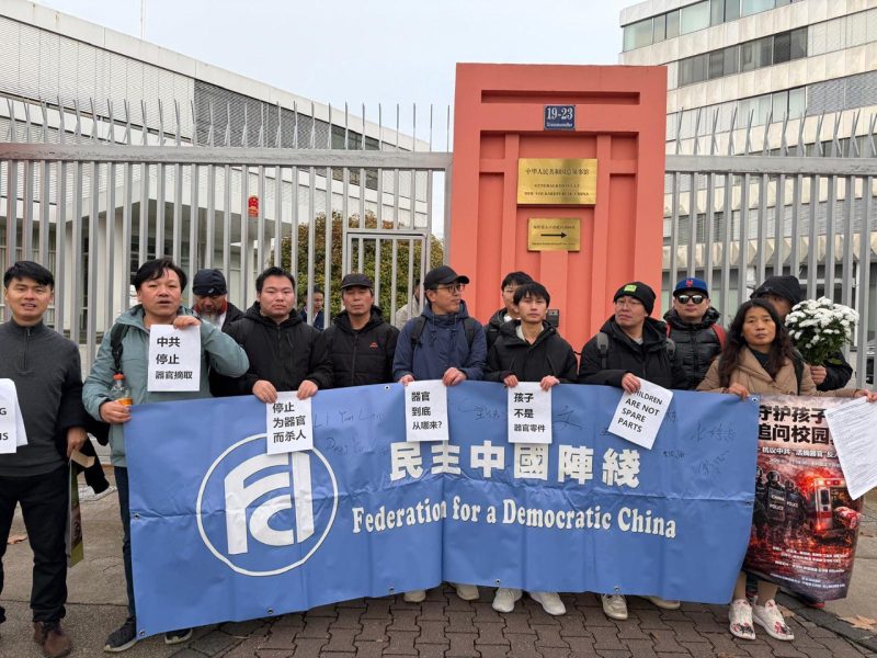 由新蔡縣旅歐異議人士楊肖杰響應中國民主黨全國委員會的呼籲,多名旅歐華人與歐洲民主人士當日在中國駐法蘭克福總領館前舉行同步抗議活動。參與者以靜默悼念與舉牌抗議的方式,公開譴責中共非法器官移植、資訊封鎖與獨裁統治。
