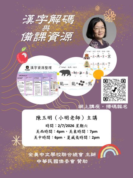 【金山灣區訊】為協助海外華語教師,突破漢字教學與備課瓶頸,全美中文學校聯合總會,將於2月7日(週六), 舉辦線上講座「漢字解碼與備課資源」,邀請資深華語老師陳玉明擔任主講,她將與教師們分享系統化的漢字解碼方法與實用備課工具。