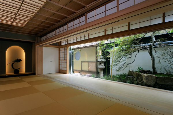 乾式採光區的離屋與和庭園,是此層的核心所在。垂枝楓的枝葉引導視線向深處延伸,從上方灑落的光影層層交疊,為景致增添了清晰的深度。這裡並非仿古的舞台,而是蘊含著日本文化中「和敬清寂」的精神。彼此尊敬的心意與澄澈寧靜的心靈,透過五感靜靜地浮現,引領人進入一段安然沉靜的時光。