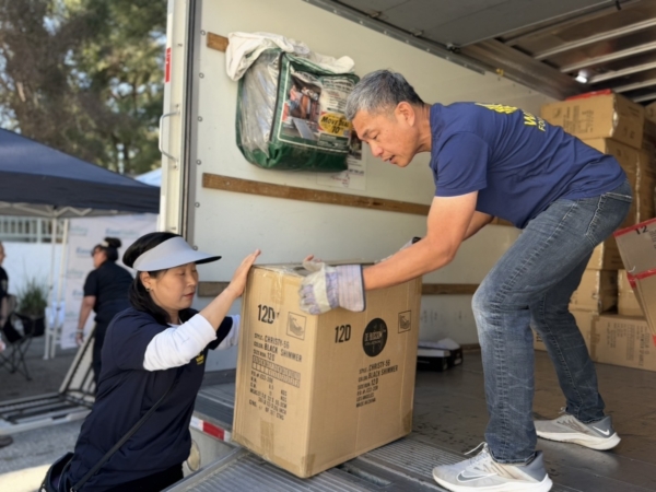 本週三(2月4日)上午11點,TERI G. MUSE家庭服務中心門前,多個族裔的幾十名女性居民排起了長長的隊伍,她們在等待領取WANYU基金會送來的一貨車女鞋和早餐食品。旁邊停放的貨車內外,WANYU基金會總裁、前核桃市市議員秦振國、華夏基金會前會長毛緯帆(Jack Mao)等人正忙著把上百箱貨物卸下來。他們來不及和別人打招呼,只顧著卸貨,額頭上已經微微冒汗。