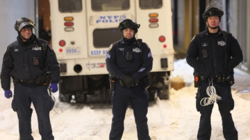 2026年1月27日,在紐約市希爾頓花園酒店,移民權利活動人士舉行靜坐示威後被捕,紐約警察局警員在一旁警戒。(Michael M. Santiago/Getty Images)
