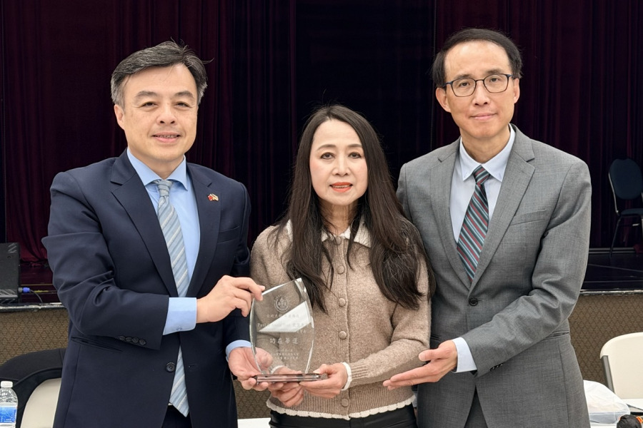 僑務諮詢委員胡立民獲頒水晶獎杯,由高玉麗(中)代領。(薛明珠/大紀元)