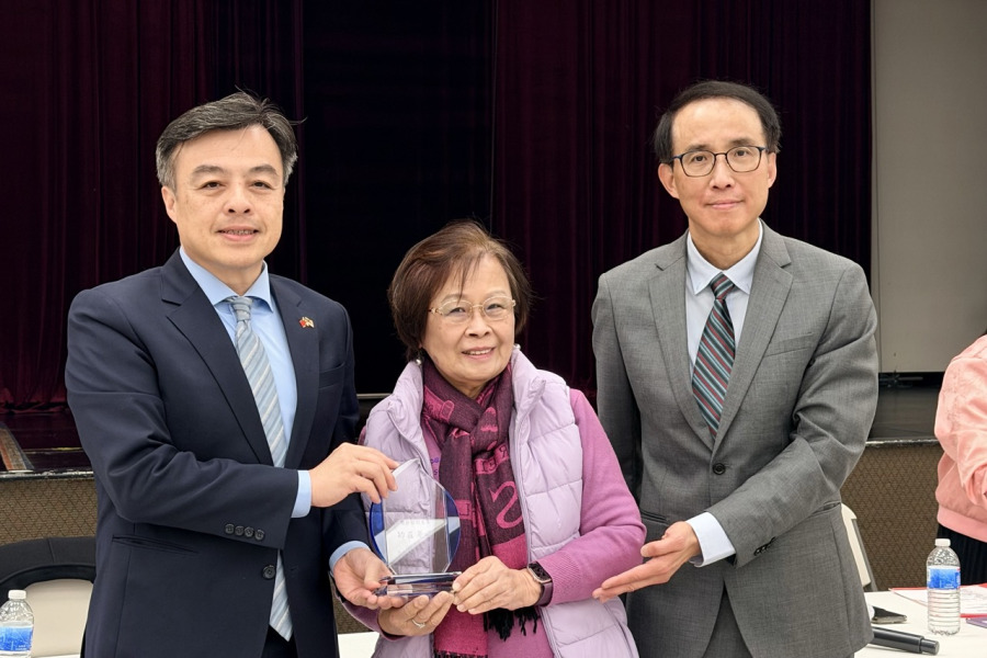 駐舊金山臺灣辦事處處長伍志翔(中)監交,向續任主委陳立功(右)頒發僑委會賀函,僑教中心副主任蔡佳樺(左)在旁宣讀賀函並共同見證。(薛明珠/大紀元)