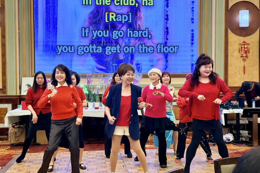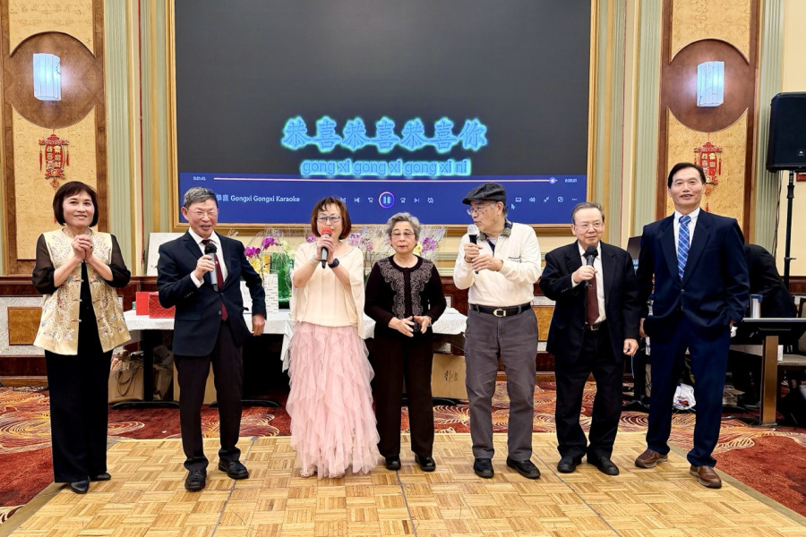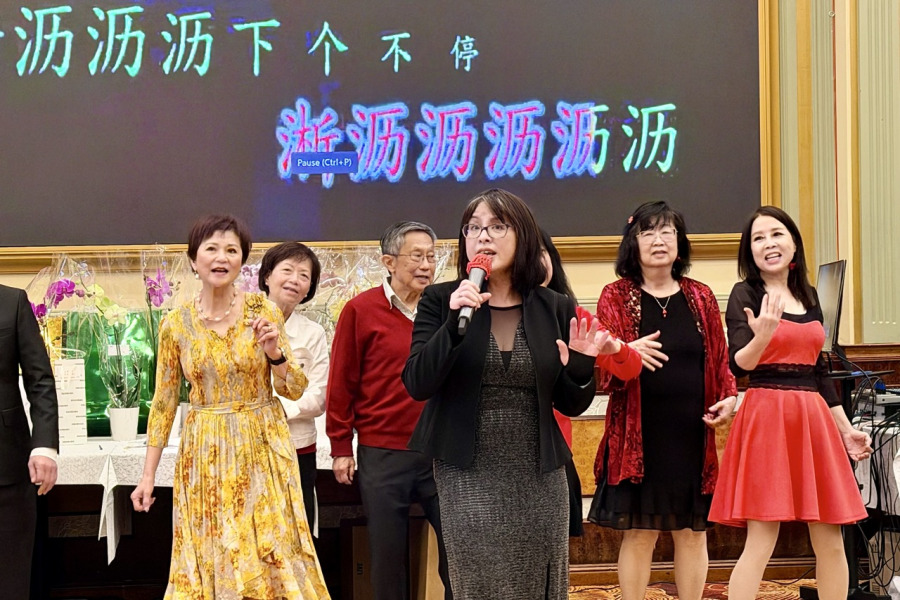 多位前會長合唱《恭喜恭喜》,為年會增添熱鬧氣氛。(薛明珠/大紀元)