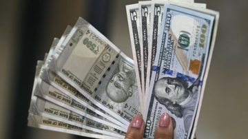 2025年8月26日,在新德里的外匯兌換處,一名工作人員手持印度盧比(左)和美元紙幣。(ARUN SANKAR/AFP via Getty Images)