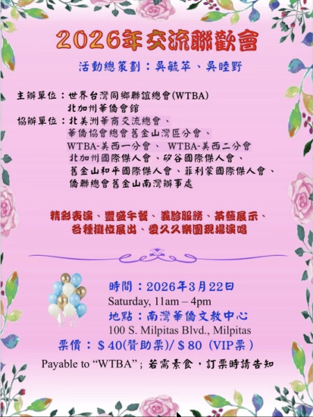 【大紀元記者薛明珠苗必達報導】世界臺灣同鄉聯誼總會(WTBA)與北加州華僑會館,於3月11日(週三)在南灣僑教中心舉行記者會,宣布將於3月22日(週日),舉辦2026年「新春交流聯歡活動」,邀請灣區僑胞齊聚一堂,在熱鬧的年節氛圍中交流聯誼。