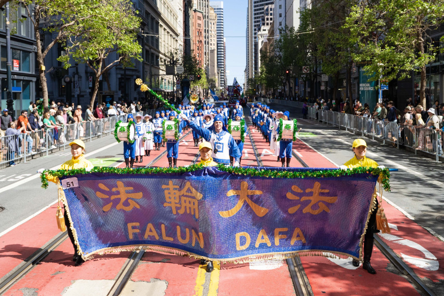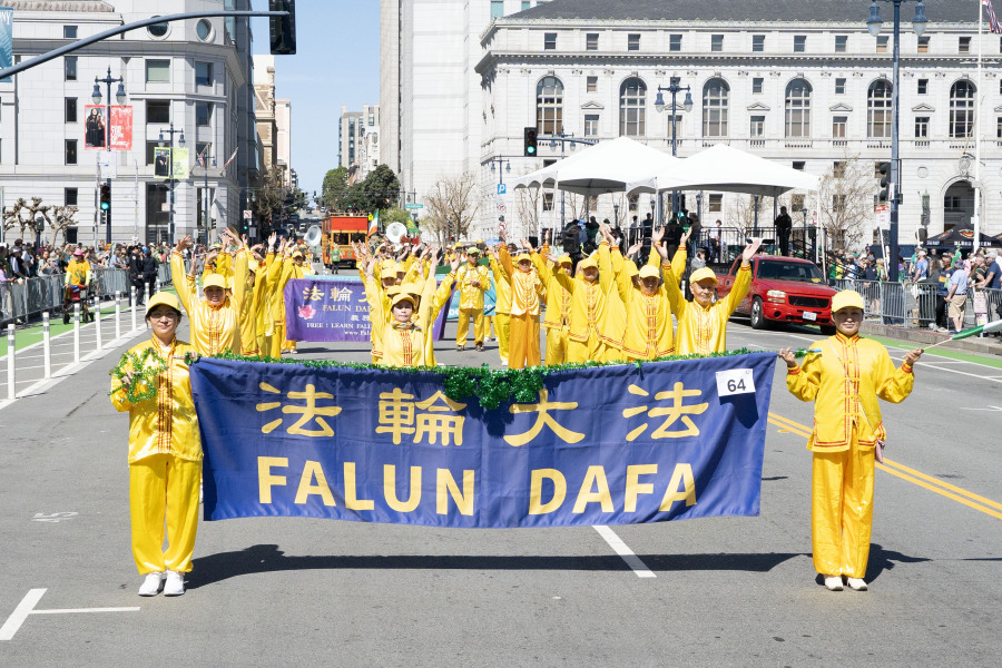 2026年3月14日,法輪大法煉功隊參加舊金山175屆聖派翠克節遊行。(周容 / 大紀元)