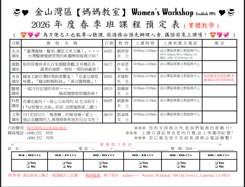【媽媽教室訊】金山灣區「媽媽教室」公布2026年度春季班課程預定表,將於4月至6月期間推出一系列涵蓋健康、園藝、美食、腦部保健、科技與人文等多元主題課程,採實體教學方式進行,歡迎社區民眾踴躍參與。