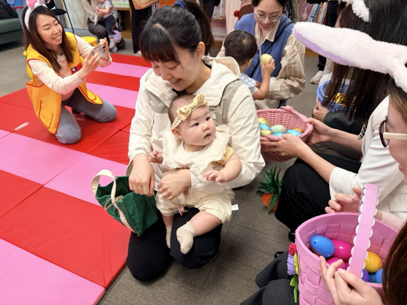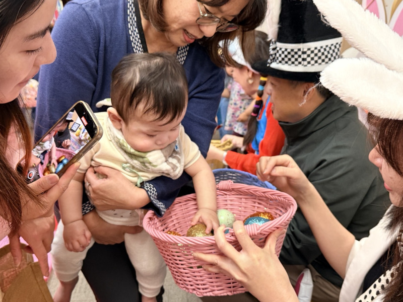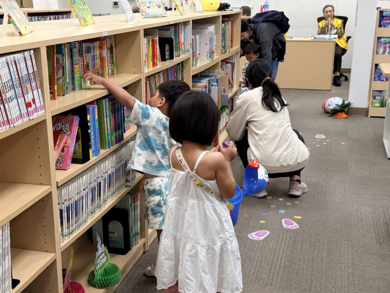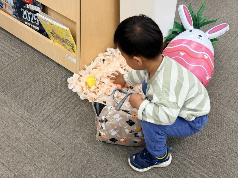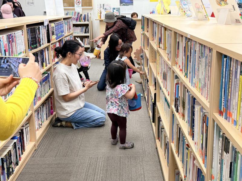 活動中,中心特別準備300顆彩蛋,每顆內含精緻小禮物。孩子們提著各式小籃子,在圖書館內興奮地穿梭尋寶,家長則在一旁忙著拍照紀錄,不時引導孩子尋找彩蛋,現場氣氛熱烈。