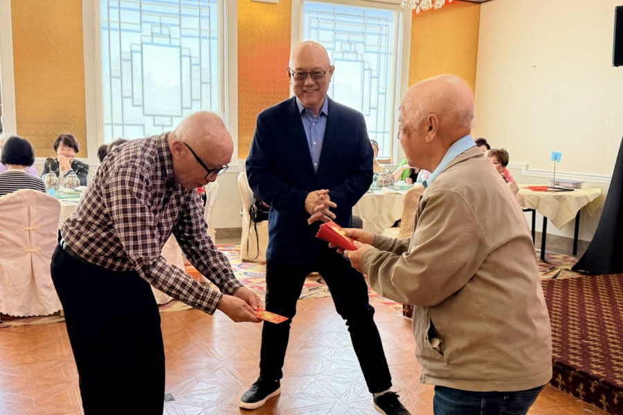 新任理事長沙澄之父於現場發紅包給90歲的長者。(薛明珠/大紀元)