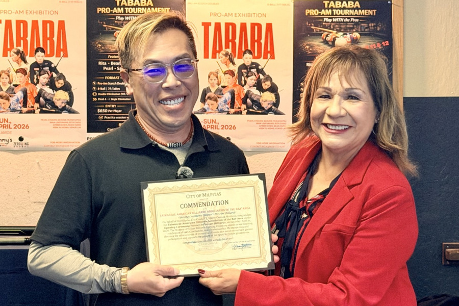 2026年4月11日,Milpitas市長Carmen Montano於灣區職業業餘撞球賽現場頒發表揚狀,肯定灣區臺美撞球協會推動國際賽事的貢獻。(薛明珠/大紀元)