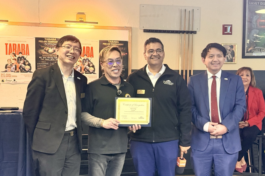 2026年4月11日,Fremont市長Raj Salwan(右二)與市議員邵陽(左一)、劉瑞蒙(右一)於灣區職業業餘撞球賽現場頒發表揚狀,肯定灣區臺美撞球協會推動國際賽事的貢獻。(薛明珠/大紀元)